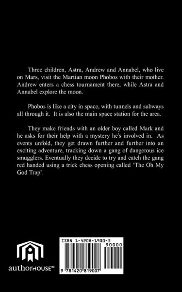 Three children, Astra, Andrew and Annabel, who live on Mars, visit the Martian moon Phobos with their mother. Andrew enters a chess tournament there, while Astra and Annabel explore the moon. Phobos is like a city in space, with tunnels and subways all through it. It is also the main space station for the area. They make friends with an older boy called Mark and he asks for their help with a mystery he's involved in. As events unfold, they get drawn further and further into an exciting adventure, tracking down a gang of dangerous ice smugglers. Eventually they decide to try and catch the gang red handed using a trick chess opening called 'The Oh My God Trap'. The recomended age group is 8-14 years. http://mysite.wanadoo-members.co.uk/thetripleas/index.html