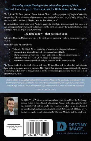 Everyday people flowing in the miraculous power of God. Normal. Commonplace. That's not just for Bible times; it's for today! The Spirit of the Lord spoke to Pastor Andrew Towe, revealing a prophetic glimpse of a coming outpouring: "I am uprooting religious systems and tearing down man's ways of doing things. This new move will be marked by My glory and the flow will be pure." In an incredible vision from God, Andrew received a prophetic announcement that there is a day fast approaching where God will move upon the Earth using everyday people that have been equipped with the Triple Threat Anointing. The time is now--that person is you! Salvation. Healing. Deliverance. This is the triple threat anointing you have been empowered to walk in! In this book you will learn how: To flow in the Triple Threat anointing of salvation, healing and deliverance. To see crisis and impossibility with supernatural eyes of faith. To have an expectant heart that is ready and positioned to experience miracles. To identify when the "Holy Ghost Affect" is in operation. To overcome demonic pushback and put the devil on the run in your life! We should not look at the book of Acts with envy. We shouldn't wish for what they had, when in fact, we have the same access to the same Holy Spirit that Jesus and the Apostles did. The alarm is sounding and an army is being awakened to the supernatural presence and power that is their inheritance in Jesus! Andrew speaks as a prophet, unfolding the mysteries of heaven. He speaks of a coming move! The prophetic anointing released in this book causes people to break forth from stagnation, complacency, and lethargy. They also break free from bondage and restriction. There is power in this revelation. - Ryan LeStrange