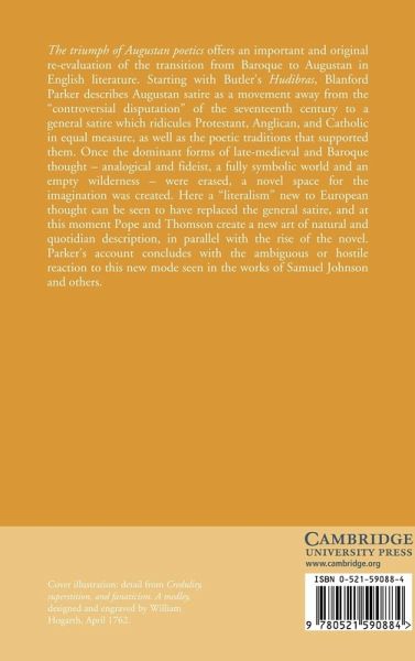 The Triumph of Augustan Poetics offers an important and original re-evaluation of the transition from Baroque to Augustan in English literature. Starting with Butler's Hudibras, Blanford Parker describes Augustan satire as a movement away from the 'controversial disputation' of the seventeenth century to a general satire which ridicules Protestant, Anglican and Catholic in equal measure, as well as the poetic traditions that supported them. Once the dominant forms of late medieval and Baroque thought - analogical and fideist, a fully symbolic world and an empty wilderness - were erased, a novel space for the imagination was created. Here a 'literalism' new to European thought can be seen to have replaced the general satire, and at this moment Pope and Thomson create a new art of natural and quotidian description, in parallel with the rise of the novel. Parker's account concludes with the ambiguous or hostile reaction to this new mode seen in the works of Samuel Johnson and others.