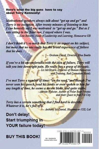 Ever had the feeling that you are failing in life? Great! Terry Kenneally will help you to Triumph in Failure! Terry is one of lifes losers, and in this VERY funny "motivational" book, he helps you understand that failing is not only normal, its desirable - why beat yourself up trying to achieve more? Just accept that you are an average person, and learn to enjoy it. Take the first step to Failure today ... buy this book!