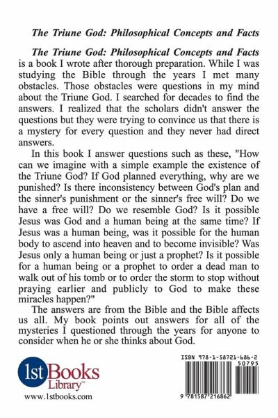 The Triune God: Philosophical Concepts and Facts is a book I wrote after thorough preparation. While I was studying the Bible through the years I met many obstacles. Those obstacles were questions in my mind about the Triune God. I searched for decades to find the answers. I realized that the scholars didn't answer the questions but they were trying to convince us that there is a mystery for every question and they never had direct answers. In this book I answer questions such as these, "How can we imagine with a simple example the existence of the Triune God? If God planned everything, why are we punished? Is there inconsistency between God's plan and the sinner's punishment or the sinner's free will? Do we have a free will? Do we resemble God? Is it possible Jesus was God and a human being at the same time? If Jesus was a human being, was it possible for the human body to ascend into heaven and to become invisible? Was Jesus only a human being or just a prophet? Is it possible for a human being or a prophet to order a dead man to walk out of his tomb or to order the storm to stop without praying earlier and publicly to God to make these miracles happen?" The answers are from the Bible and the Bible affects us all. My book points out answers for all of the mysteries I questioned through the years for anyone to consider when he or she thinks about God.