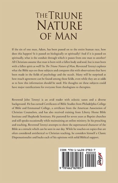 If the sin of one man, Adam, has been passed on to the entire human race, how does this happen? Is it passed on biologically or spiritually? And if it is passed on spiritually, what is the conduit through which it passes from one man to another? All Christians assume that man is born with a fallen body and soul, but is man born with a fallen spirit as well? In The Triune Nature of Man, Reverend Terenyi explores what the Bible says on these subjects and compares this with observations that have been made in the fields of psychology and the occult. Many will be surprised at how much agreement can be found among these fields, even while they are at odds as to how this information should be used. His thoughts on these subjects could have major ramifications for everyone from theologians to therapists. Reverend John Terenyi is an avid reader with eclectic tastes and a diverse background. He has earned Certificates of Bible Studies from Philadelphia College of Bible and Emmanuel College, a certificate from the American Association of Christian Counselors, and has also received training from Liberty Home Bible Institute and Shepherds Seminary. He pastored for seven years at Baptist churches and still speaks occasionally while maintaining an online ministry. In his preaching and teaching, Reverend Terenyi attempts to show the supernatural character of the Bible as a miracle which can be seen in our day. While he touches on topics that are often considered antithetical to Christian teaching, he considers himself a Classic Dispensationalist and backs each of his opinions with solid Biblical support.