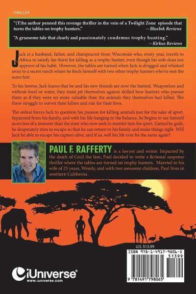 "(T)he author penned this revenge thriller in the vein of a Twilight Zone episode that turns the tables on trophy hunters." —BlueInk Reviews "A gruesome tale that clearly and passionately condemns trophy hunting." —Kirkus Reviews Jack is a husband, father, and chiropractor from Wisconsin who, every year, travels to Africa to satisfy his thirst for killing as a trophy hunter, even though his wife does not approve of his habit. However, the tables are turned when Jack is drugged and whisked away to a secret ranch where he finds himself with two other trophy hunters who’ve met the same fate. To his horror, Jack learns that he and his new friends are now the hunted. Weaponless and without food or water, they must pit themselves against skilled bow hunters who pursue them as if they were no more valuable than the animals they themselves had killed. The three struggle to outwit their killers and run for their lives. The ordeal forces Jack to question his passion for killing animals just for the sake of sport. Separated from his family, and with his life hanging in the balance, he begins to see himself as no less of a monster than the men who now seek to murder him for sport. Gutted by guilt, he desperately tries to escape so that he can return to his family and make things right. Will Jack be able to escape his captors alive, and if so, will his life ever be the same again?