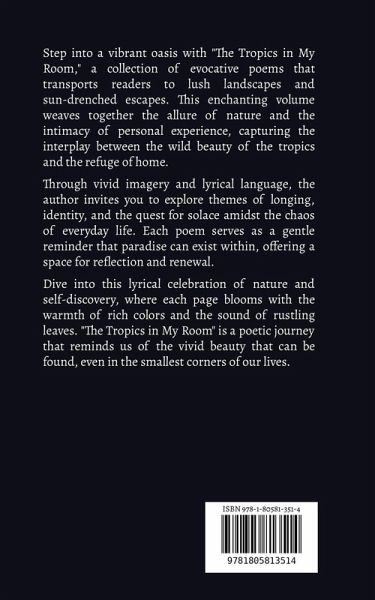 Step into a vibrant oasis with "The Tropics in My Room," a collection of evocative poems that transports readers to lush landscapes and sun-drenched escapes. This enchanting volume weaves together the allure of nature and the intimacy of personal experience, capturing the interplay between the wild beauty of the tropics and the refuge of home. Through vivid imagery and lyrical language, the author invites you to explore themes of longing, identity, and the quest for solace amidst the chaos of everyday life. Each poem serves as a gentle reminder that paradise can exist within, offering a space for reflection and renewal. Dive into this lyrical celebration of nature and self-discovery, where each page blooms with the warmth of rich colors and the sound of rustling leaves. "The Tropics in My Room" is a poetic journey that reminds us of the vivid beauty that can be found, even in the smallest corners of our lives.