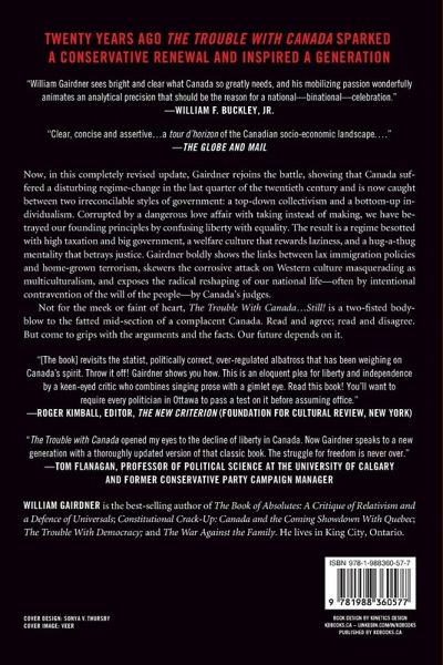 BACK IN PRINT! In 1990 William Gairdner published The Trouble with Canada and it sparked a conservative renewal and inspired a generation. In 1910 he completely this update, The Trouble with Canada ... Still! Gairdner rejoins the battle, showing that Canada suffered a disturbing regime change in the last quarter of the twentieth century and is now caught between two irreconcilable styles of government: top-down collectivism and bottom-up individualism. The result is a regime besotted with high taxation and big government, a welfare culture that rewards laziness, and a hug-a-thug mentality that betrays justice. In The Trouble with Canada ... Still! Gairdner puts familiar topics under a searing new light, and recent issues, such as immigration, diversity, and corruption of the law are confronted head on, yielding many startling -- and sure to be controversial -- conclusions. This book is a bold clarion call to arms for Canada to examine and renew itself before it is too late. Reviews "... a provocative and stimulating work of advocacy, as well as a rigorous factual summary of the consequences of Canada's profound move to the left of the past half century ... no one concerned with Canadian public policy should be without this unique, now almost institutional, work. Even those who disagree with aspects of it will find its assemblage of little-publicized facts and array of options and prospects indispensable to the national political debate under way." -- Conrad Black