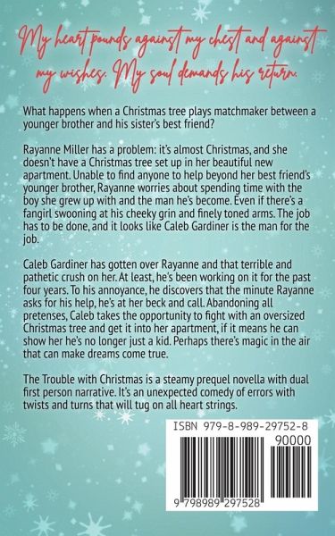 What happens when a Christmas tree plays matchmaker between a younger brother and his sister's best friend? Rayanne Miller has a problem: it's almost Christmas, and she doesn't have a Christmas tree set up in her beautiful new apartment. Unable to find help beyond her best friend's younger brother, Rayanne is worried about spending time with the boy she grew up with and the man he's become. Even if there's a fangirl swooning at his cheeky grin and finely toned arms. The job must be completed, and it looks like Caleb Gardiner is the man for the job. Caleb Gardiner has gotten over Rayanne-gotten over that terrible and pathetic crush that started when he understood that girls could turn into goddesses with the blink of an eye. To his annoyance, he discovers that the minute Rayanne asks for his help, he's at her beck and call. Abandoning all pretenses, Caleb takes the opportunity to fight with an oversized Christmas tree and get it into her apartment, if it means he can show her he's no longer just a kid. Perhaps there's magic in the air that can make dreams come true. The Trouble with Christmas is a steamy prequel novella with dual first person narrative. It's an unexpected comedy of errors with twists and turns that will tug on all heart strings. Newly revised, this edition includes an extra 9800 words in a second epilogue. This edition will also compliment the audiobook with the updated manuscript.
