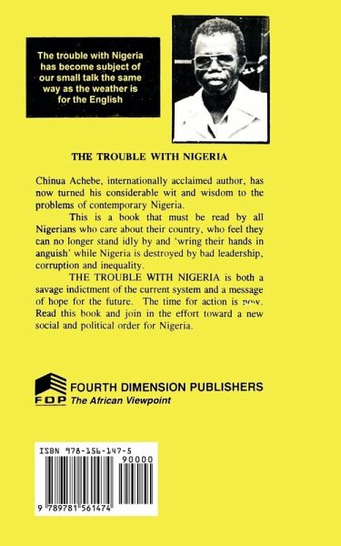 The eminent African novelist and critic, here addresses Nigeria's problems, aiming to challenge the resignation of Nigerians and inspire them to reject old habits which inhibit Nigeria from becoming a modern and attractive country. In this famous book now reprinted, he professes that the only trouble with Nigeria is the failure of leadership, because with good leaders Nigeria could resolve its inherent problems such as tribalism; lack of patriotism; social injustice and the cult of mediocrity; indiscipline; and corruption.