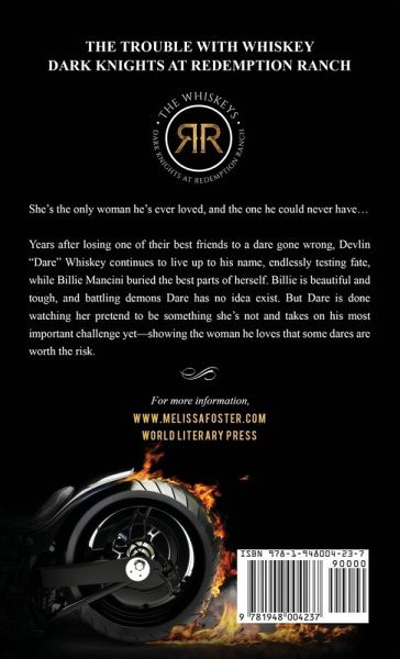 From New York Times bestselling author Melissa Foster comes The Whiskeys: Dark Knights at Redemption Ranch, a new small-town, big-family series of standalone romance novels featuring fiercely loyal, insanely sexy bikers who give horses-and people-a second chance. Buckle up for a wild ride in Hope Valley, CO, as these big-hearted badasses and their sassy sisters wrangle in their forever loves. No cliffhangers, no cheating, and always a happily ever after. Special edition paperback include a collage of images pertaining to the story, a bonus excerpt showing the first introduction to Dare Whiskey and Billie Mancini within the Love in Bloom world, and a special foreword. She's the only woman he's ever loved, and the one he could never have... Years after losing one of their best friends to a dare gone wrong, Devlin "Dare" Whiskey continues to live up to his name, endlessly testing fate, while Billie Mancini buried the best parts of herself. Billie is beautiful and tough, and battling demons Dare has no idea exist. But Dare is done watching her pretend to be something she's not and takes on his most important challenge yet-showing the woman he loves that some dares are worth the risk. More Whiskeys at Redemption Ranch coming soon: The Trouble with Whiskey For the Love of Whiskey Get to know the Whiskey cousins: The Whiskeys: Dark Knights at Peaceful Harbor Tru Blue Truly Madly Whiskey Driving Whiskey Wild Wicked Whiskey Love Mad About Moon Taming My Whiskey The Gritty Truth In for A Penny Running on Diesel The Wickeds: Dark Knights at Bayside A Little Bit Wicked The Wicked Aftermath Crazy, Wicked Love The Wicked Truth