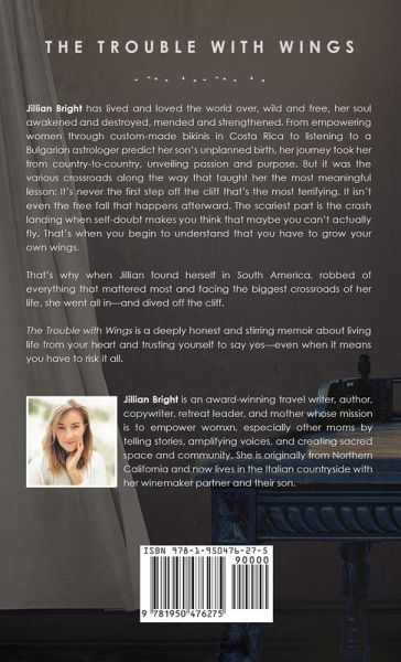 The Trouble with Wings is a deeply honest and stirring memoir told with lyrical prose and unflinching honesty about a woman who, in learning that every wild choice comes with a reckoning, learns to trust herself. One year into a solo journey around the world, Jillian Bright was finally chasing the writing career she'd dreamed of for years-traveling, photographing, and collecting stories along the way. Then her backpack was stolen, along with two book manuscripts and a hard drive full of writing and photography. Three weeks later, she found out she was pregnant after rekindling a love affair with a man she hadn't seen in four years. Staring down a future she never saw coming, and certainly never saw herself wanting, Jillian retraces the choices over the last decade that led her to that moment: from designing custom bikinis in a bohemian beach town in Costa Rica to living off-grid in the mountains of Northern California to hiking to sacred lakes at 15,000 feet in the Himalaya and more... Through heartbreak, risk, romance, and reinvention, she began to understand what her years of wandering had really taught her-not how to escape life, but how to meet it head on. The Trouble with Wings is about the freedom that comes from living with your heart wide open and the responsibility that comes with it. Because once you've known that kind of perspective, you can't un-know it. And eventually, she began to understand what those years had taught her and what it means to stand at the edge of your old life, ready to claim a new one. For anyone who's ever felt stuck or afraid to make the wrong choice, this is a story about having the courage to make mistakes-and the heart to let them shape you.