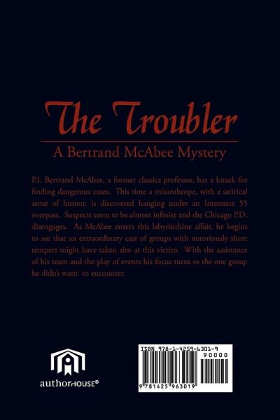 P.I. Bertrand McAbee, a former classics professor, has a knack for finding dangerous cases. This time a misanthrope, with a satirical sense of humor, is discovered hanging under an Interstate 55 overpass. Suspects seem to be almost infinite and the Chicago P.D. disengages. As McAbee enters this labyrinthine affair, he begins to see that an extraordinary cast of groups with notoriously short tempers might have taken aim at this victim. With the assistance of his team and the play of events his focus turns to the one group he didn't want to encounter.