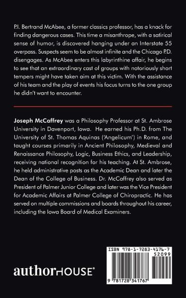 P.I. Bertrand McAbee, a former classics professor, has a knack for finding dangerous cases. This time a misanthrope, with a satirical sense of humor, is discovered hanging under an Interstate 55 overpass. Suspects seem to be almost infinite and the Chicago P.D. disengages. As McAbee enters this labyrinthine affair, he begins to see that an extraordinary cast of groups with notoriously short tempers might have taken aim at this victim. With the assistance of his team and the play of events his focus turns to the one group he didn't want to encounter.