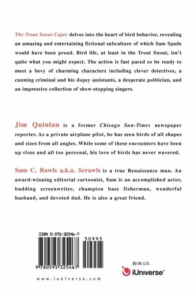 The Trout Snout Caper delves into the heart of bird behavior, revealing an amazing and entertaining fictional subculture of which Sam Spade would have been proud. Bird life, at least in the Trout Snout, isn't quite what you might expect. The action is fast paced so be ready to meet a bevy of charming characters including clever detectives, a cunning criminal and his dopey assistants, a desperate politician, and an impressive collection of show-stopping singers.
