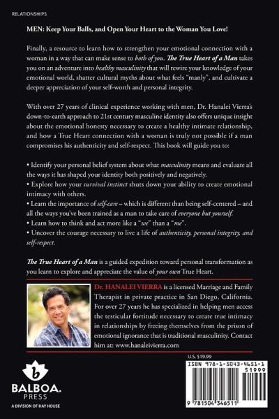 MEN: Keep Your Balls, and Open Your Heart to the Woman You Love! Finally, a resource to learn how to strengthen your emotional connection with a woman in a way that can make sense to both of you. The True Heart of a Man takes you on an adventure into healthy masculinity that will rewire your knowledge of your emotional world, shatter cultural myths about what feels "manly", and cultivate a deeper appreciation of your self-worth and personal integrity. With over 27 years of clinical experience working with men, Dr. Hanalei Vierra's down-to-earth approach to 21st century masculine identity also offers unique insight about the emotional honesty necessary to create a healthy intimate relationship, and how a True Heart connection with a woman is truly not possible if a man compromises his authenticity and self-respect. This book will guide you to: • Identify your personal belief system about what masculinity means and evaluate all the ways it has shaped your identity both positively and negatively. • Explore how your survival instinct shuts down your ability to create emotional intimacy with others. • Learn the importance of self-care - which is different than being self-centered - and all the ways you've been trained as a man to take care of everyone but yourself. • Learn how to think and act more like a "we" than a "me". • Uncover the courage necessary to live a life of authenticity, personal integrity, and self-respect. The True Heart of a Man is a guided expedition toward personal transformation as you learn to explore and appreciate the value of your own True Heart.