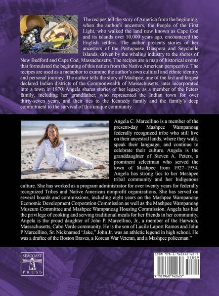 The recipes tell the story of America from the beginning, when the author's ancestors, the People of the First Light, who walked the land now known as Cape Cod and its islands over 10,000 years ago, encountered the English settlers. The author presents stories of her ancestors of the Portuguese Diaspora and Seychelle Islands, driven by the whaling industry to the shores of New Bedford and Cape Cod, Massachusetts. The recipes are a map of historical events that formulated the beginning of this nation from the Native American perspective. The recipes are used as a metaphor to examine the author's own cultural and ethnic identity and personal journey. The author tells the story of Mashpee, one of the last and largest declared Indian districts of the Commonwealth of Massachusetts, later incorporated into a town in 1870. Angela shares stories of her legacy as a member of the Peters family, including her grandfather, who represented the Indian town for over thirty-seven years, and their ties to the Kennedy family and the family's deep commitment to the survival of this unique community. Angela C. Marcellino is a member of the present-day Mashpee Wampanoag federally recognized tribe who still live on their ancestral lands, where they walk, speak their language, and continue to celebrate their culture. Angela is the granddaughter of Steven A. Peters, a prominent selectman who served the town of Mashpee from 1927-1954. Angela has strong ties to her Mashpee tribal community and her Indigenous culture. She has worked as a program administrator for over twenty years for federally recognized Tribes and Native American nonprofit organizations. She has served on several boards and commissions, including eight years on the Mashpee Wampanoag Economic Development Corporation Commission as well as the Mashpee Wampanoag Museum Committee and Mashpee Wampanoag Housing Commission. Angela has had the privilege of cooking and serving traditional meals for her friends in her community. Angela is the proud daughter of John P. Marcellino, Jr., a member of the Harwich, Massachusetts, Carbo Verde community. He is the son of Lucile Laport Ramos and John P Marcellino, Sr. Nicknamed "Jake," John Jr. was an athletic legend in high school. He was a draftee of the Boston Braves, a Korean War Veteran, and a Mashpee policeman.