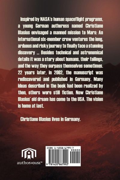 Inspired by NASA''s human spaceflight programs, a young German authoress named Christiane Blasius envisaged a manned mission to Mars: An international six-member crew ventures the long, arduous and risky journey to finally face a stunning discovery . Besides technical and astronomical details it was a story about humans, their failings, and the way they surpass themselves sometimes. 22 years later, in 2002, the manuscript was rediscovered and published in Germany. Many ideas described in the book had been realized by then, others were still fiction. Now Christiane Blasius'' old dream has come to the USA. The vision is home at last.