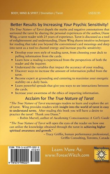 Get Better Results by Increasing Your Psychic Sensitivity! The True Nature of Tarot dispels the myths and negative connotations that surround the tarot by sharing the personal experiences of the author, Diane Wing, a tarot reader with 25 years of experience. Tarot is discussed as a tool of enlightenment and understanding. Diane Wing shares intuitive techniques for reading that take you beyond the conventional card meanings and deep into tarot as a tool to channel energy and increase psychic sensitivity: Develop your own style of reading tarot, from choosing your deck to pulling information from the cards. Learn how a reading is experienced from the perspectives of both the reader and the inquirer. Understand the variables that impact the accuracy of your reading. Discover ways to increase the amount of information pulled from the tarot. Become expert at grounding and centering to maximize your energetic stability on a daily basis. Learn powerful spreads that give you ways to see interactions between the cards. Increase your awareness of the ethics of imparting information. Acclaim for The True Nature of Tarot "The True Nature of Tarot encourages readers to learn and explore the art of tarot. Wing provides readers with insight into the world of tarot in easy to understand terms. After reading this book you will have a desire to practice the tarot! Thank you Diane." --Robin Marvel, author of Awakening Consciousness: A Girl's Guide "The True Nature of Tarot will open the eyes of the reader on how one can utilize the knowledge obtained through the tarot in achieving higher spiritual awareness and growth." --Tracy Griffin, human performance professional, Griffin Consulting, Toronto, Canada Learn More At: www.ForestWitch.com Another empowering book from Marvelous Spirit Press www.MarvelousSpirit.com OCC024000 Body, Mind & Spirit : Divination - Tarot SEL000000 Self-Help : General PSY045060 Psychology : Movements - Jungian