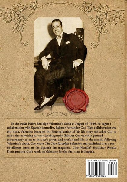 In the months before silent film icon Rudolph Valentino's death, he began a collaboration with Spanish journalist, Baltasar Fernández Cué. That collaboration was this book. Valentino lamented the glut of fictionalization about his life story and asked Cué to assist him in writing his true autobiography. During the spring of 1926, Baltasar Fernández Cué became a familiar member of Valentino's entourage as he was granted extraordinary access to the star's private life and professional activities. He lunched in Valentino's United Artists' bungalow and visited the location filming of The Son of the Sheik. Cué was a frequent guest in Valentino's home in Los Angeles, Falcon Lair and befriended Valentino's last love interest, Pola Negri and his only brother, Alberto Guglielmi Valentino. Before Valentino left on his fateful trip to New York City, he gave Cué various personal letters and documents for reference and assured him he would return within three weeks to write his autobiography. Valentino would die soon after in New York City, leaving Cué determined to fulfill his great friend's wish. With the assistance of Pola Negri and Valentino's friend Douglas Gerrard and with the endorsement of Alberto Guglielmi Valentino, Cué wrote The True Rudolph Valentino. With his main source no longer available, Cué would construct the book from his eye-witness accounts and his experience with Valentino and his inner circle. Lamentably, he would rely on a few of the studio-generated myths Valentino hoped to dispel. Cué published his work in the Spanish language fan magazine Cine-Mundial as a ten installment series, from May 1927 to February of 1928. Cué recounts detailed scenarios of Valentino's daily, professional and private life and includes correspondence between Valentino and Natacha Rambova and Douglas Gerrard. He grants fresh insight into these fascinating screen personalities and the tumultuous time prior to Valentino's death. Renato Floris' translation presents this historically valuable book for the first time to an English-speaking audience. Floris conducted a meticulous research of Cué's quizzical phraseology and worked with the assistance and analysis of many generous individuals in England, Argentina, Spain, Chile, Italy and the US. The True Rudolph Valentino is a full-color publication which includes reproductions of the original Cine-Mundial installment illustrations.