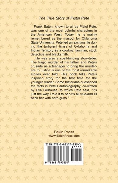 Frank Eaton, known to all as Pistol Pete, was one of the most colorful characters in the American West. Today, he is mainly remembered as the mascot for Oklahoma State University. Pete led an exciting life during the turbulent times of Oklahoma and Indian Territory as a cowboy, lawman, stock detective and blacksmith. He was also a spell-binding storyteller. The tragic murder of his father and Pete's crusade as a teenager to bring the murderers to justice is one of the most remarkable stories ever told. This book tells Pete's inspiring story for the first time for the younger reader. Some historians questioned the facts in Pete's autobiography, co-written by Eva Gillhouse, to which Pete said, "It's just the way I told it to her -I t's all true - and I'll back her with both guns."