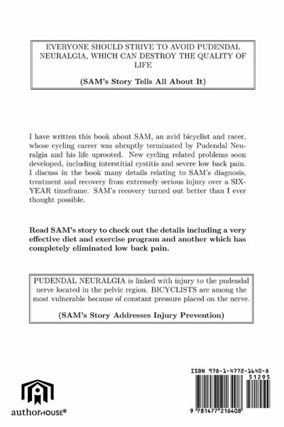 I have written this book about SAM, an avid bicyclist and racer, whose cycling career was abruptly terminated by Pudendal Neuralgia and his life uprooted. New cycling related problems soon developed, including interstitial cystitis and severe low back pain. I discuss in the book many details relating to SAM's diagnosis, treatment and recovery from extremely serious injury over a SIX-YEAR timeframe. SAM's recovery turned out better than I ever thought possible. Read SAM's story to check out the details including a very effective diet and exercise program and another which has completely eliminated low back pain.