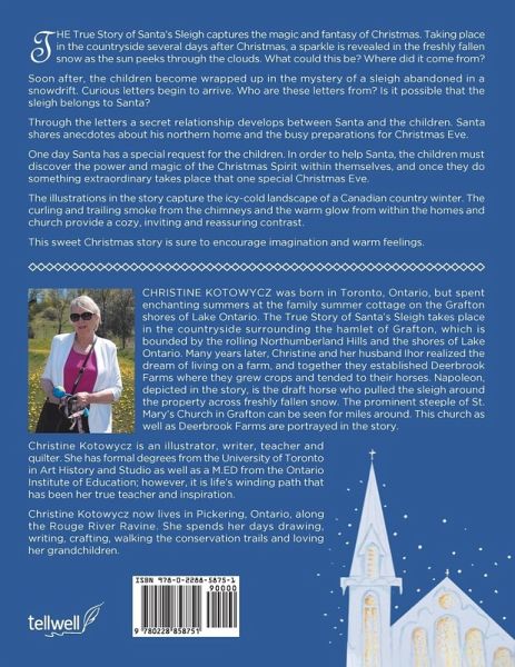 Christine Kotowycz was born in Toronto, Ontario, but spent enchanting summers at the family summer cottage on the Grafton shores of Lake Ontario. The True Story of Santa's Sleigh takes place in the countryside surrounding the hamlet of Grafton, which is bounded by the rolling Northumberland Hills and the shores of Lake Ontario. Many years later, Christine and her husband Ihor realized the dream of living on a farm, and together they established Deerbrook Farms where they grew crops and tended to their horses. Napoleon, depicted in the story, is the draft horse who pulled the sleigh around the property across freshly fallen snow. The prominent steeple of St. Mary's Church in Grafton can be seen for miles around. This church as well as Deerbrook Farms are portrayed in the story.Christine Kotowycz is an illustrator, writer, teacher and quilter. She has formal degrees from the University of Toronto in Art History and Studio as well as a M.ED from the Ontario Institute of Education; however, it is life's winding path that has been her true teacher and inspiration.Christine Kotowycz now lives in Pickering, Ontario, along the Rouge River Ravine. She spends her days drawing, writing, crafting, walking the conservation trails and loving her grandchildren.