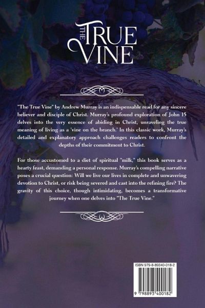 "The True Vine" by Andrew Murray is an indispensable read for any sincere believer and disciple of Christ. Murray's profound exploration of John 15 delves into the very essence of abiding in Christ, unraveling the true meaning of living as a 'vine on the branch.' In this classic work, Murray's detailed and explanatory approach challenges readers to confront the depths of their commitment to Christ. For those accustomed to a diet of spiritual "milk," this book serves as a hearty feast, demanding a personal response. Murray's compelling narrative poses a crucial question: Will we live our lives in complete and unwavering devotion to Christ, or risk being severed and cast into the refining fire? The gravity of this choice, though intimidating, becomes a transformative journey when one delves into "The True Vine." As readers navigate Murray's insightful teachings, they are confronted with the profound beauty of surrendering to God. The book inspires a deep desire to embrace a life wholly and unreservedly devoted to Christ. "The True Vine" is challenges, enlightens, and ultimately leads to a profound understanding of the joy and fulfillment found in surrendering to God. Immerse yourself in this literary gem and discover the path to a life anchored in the true vine-Christ.