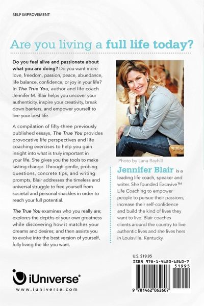 Are you living a full life today? Do you feel alive and passionate about what you are doing? Do you want more love, freedom, passion, peace, abundance, life balance, confidence, or joy in your life? In The True You, author and life coach Jennifer M. Blair helps you uncover your authenticity, inspire your creativity, break down barriers, and empower yourself to live your best life A compilation of fifty-three previously published essays, The True You provides provocative life perspectives and life coaching exercises to help you gain insight into what is truly important in your life. She gives you the tools to make lasting change. Through gentle, probing questions, concrete tips, and writing prompts, Blair addresses the timeless and universal struggle to free yourself from societal and personal shackles in order to reach your full potential. The True You examines who you really are; explores the depths of your own greatness while discovering how it matches your dreams and desires; and then assists you to evolve into the best version of yourself, fully living the life you want.