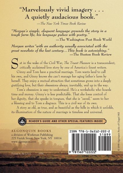 Ginny, who marries Tom at the turn of the century after her family has given up on her ever marrying, narrates THE TRUEST PLEASURE--the story of their life together on her father's farm in the western North Carolina mountains. They have a lot in common--love of the land and fathers who fought in the Civil War. Tom's father died in the war, but Ginny's father came back to western North Carolina to hold on to the farm and turn a profit. Ginny's was a childhood of relative security, Tom's one of landlessness. Truth be known--and they both know it--their marriage is mutually beneficial in purely practical terms. Tom wants land to call his own. Ginny knows she can't manage her aging father's farm by herself. But there is also mutual attraction, and indeed their "loving" is deeply gratifying. What keeps getting in the way of it, though, are their obsessions. Tom Powell's obsession is easy to understand. He's a workaholic who hoards time and money. Ginny is obsessed by Pentecostal preaching. That she loses control of her dignity, that she speaks "in tongues," that she is "saved," seem to her a blessing and to Tom a disgrace. It's not until Tom lies unconscious and at the mercy of a disease for which the mountain doctor has no cure that Ginny realizes her truest pleasure is her love for her husband. Like COLD MOUNTAIN, the time and place of THE TRUEST PLEASURE are remote from contemporary American life, but its rendering of the nature of marriage is timeless and universal. Praise for THE TRUEST PLEASURE: "Marvelously vivid imagery. . . . a quietly audacious book."--The New York Times Book Review; "Morgan deeply understands these people and their world, and he writes about them with an authority usually associated with the great novelists of the last century. . . . the book is astonishing."--The Boston Book Review;