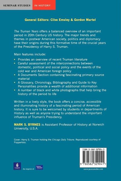 The Truman Years is a concise yet thorough examination of the critical postwar years in the United States. Byrnes argues that the major trends and themes of the American history have their origins during the presidency of Harry S. Truman. He synthesizes the recent Truman literature, and explains the links between domestic U.S. political and social trends and cold war foreign policy.