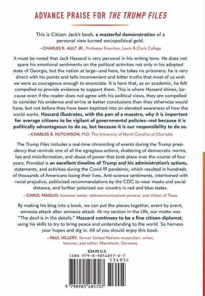 In twenty-first century United States of America, a corrupt businessman is elected president, is impeached twice while in office, directs a failed coup d état and an attack on Congress, but still remains at-large. He's thinking about running again. Jack Hassard, internationally known science educator, researcher and author, examines the interplay of politics and science to unravel the effects that Donald Trump and his administration had on American society. Using Robert Jay Lifton's concept of "a witnessing professional," and Charles R. Ault's introduction of him as "Citizen Jack," The Trump Files is Citizen Jack Hassard's eye-opening book revealing how Donald Trump affected not only American democracy, but human rights, science, and public health. Citizen Jack's blog writing over a six year period was the foundation to create story after story organized around six themes: Part I: Trumpism, sets the stage with the story of how extreme polarization of American society made it possible for Trump's "America First" policy to gain the White House. The story explores how an authoritarian president led America's democracy into danger. Part II: Human Rights, is a story of immigration violence, equity, and voting rights. Part III: Scrutiny, is a story of Donald Trump's chronic violation of his oath of office. This is a story of corruption as seen by one citizen from Georgia Part IV: Science, is a science educator's story of how Trump's administration dismantled and diminished science in all areas of government at the peril of the Earth's air, water, land, climate, and-most importantly-citizens. Part V: COVID-19, is the tragedy of Donald Trump's failure as a leader during the SARS-CoV-2 pandemic and the impact on millions of Americans. The story explains how viruses come about, how they can be mitigated, and what happens if people are not told the truth about infectious diseases. Part VI: Departure, describes how Trump promoted the "Big Lie Conspiracy" that the 2020 election was stolen from him. It's a story of how Trump instigated political violence by sending right-wing mobs to seditiously attack the nation's Capitol, which led to his second impeachment for causing an insurrection. Although not a journalist or media personality, Citizen Jack uses his researcher, blogger, professor, and citizen credentials to create a political science story about a grim period when Donald Trump was president. Jack weaves his abilities as an accomplished author and teacher of science, with citizen diplomacy, blogging, and the local politics of Georgia. Jack composes a history of a president and his administration who undermined the tenets of a liberal democracy, nearly overthrowing the American government with his Big Lie and attempted coup d'état. Dive into Citizen Jack's Gripping and Detailed Story of the Trump Years.