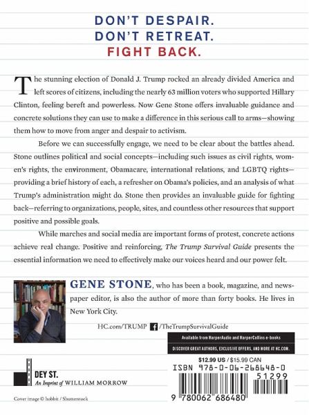 The stunning election of Donald J. Trump rocked an already divided America and left scores of citizens, including the nearly sixty-five million voters who supported Hillary Clinton, feeling bereft and powerless. Now, Gene Stone, author of The Bush Survival Bible, offers invaluable guidance and concrete solutions they can use to make a difference in this serious call-to-arms-showing them how to move from anger and despair to activism as the Trump presidency is in full swing and he signs one executive order after another.