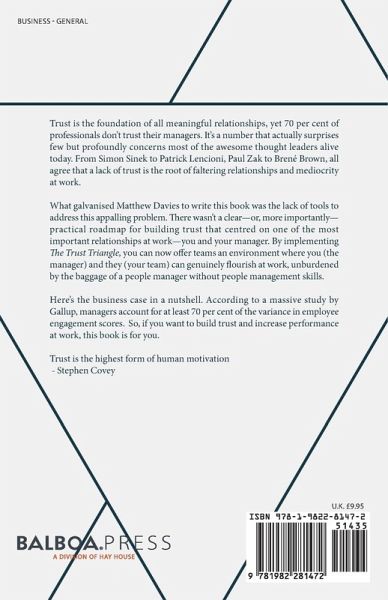 Trust is the foundation of all meaningful relationships, yet 70 per cent of professionals don't trust their managers. It's a number that actually surprises few but profoundly concerns most of the awesome thought leaders alive today. From Simon Sinek to Patrick Lencioni, Paul Zak to Brené Brown, all agree that a lack of trust is the root of faltering relationships and mediocrity at work. What galvanised Matthew Davies to write this book was the lack of tools to address this appalling problem. There wasn't a clear-or, more importantly-practical roadmap for building trust that centred on one of the most important relationships at work-you and your manager. By implementing The Trust Triangle, you can now offer teams an environment where you (the manager) and they (your team) can genuinely flourish at work, unburdened by the baggage of a people manager without people management skills. Here's the business case in a nutshell. According to a massive study by Gallup, managers account for at least 70 per cent of the variance in employee engagement scores. So, if you want to build trust and increase performance at work, this book is for you. Trust is the highest form of human motivation - Stephen Covey