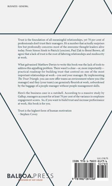 Trust is the foundation of all meaningful relationships, yet 70 per cent of professionals don't trust their managers. It's a number that actually surprises few but profoundly concerns most of the awesome thought leaders alive today. From Simon Sinek to Patrick Lencioni, Paul Zak to Brené Brown, all agree that a lack of trust is the root of faltering relationships and mediocrity at work. What galvanised Matthew Davies to write this book was the lack of tools to address this appalling problem. There wasn't a clear-or, more importantly-practical roadmap for building trust that centred on one of the most important relationships at work-you and your manager. By implementing The Trust Triangle, you can now offer teams an environment where you (the manager) and they (your team) can genuinely flourish at work, unburdened by the baggage of a people manager without people management skills. Here's the business case in a nutshell. According to a massive study by Gallup, managers account for at least 70 per cent of the variance in employee engagement scores. So, if you want to build trust and increase performance at work, this book is for you. Trust is the highest form of human motivation - Stephen Covey
