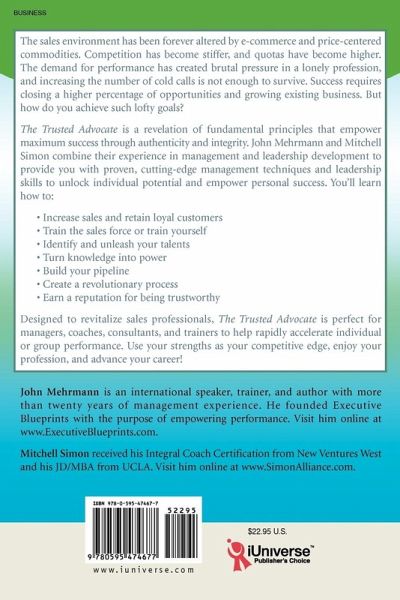 The sales environment has been forever altered by e-commerce and price-centered commodities. Competition has become stiffer, and quotas have become higher. The demand for performance has created brutal pressure in a lonely profession, and increasing the number of cold calls is not enough to survive. Success requires closing a higher percentage of opportunities and growing existing business. But how do you achieve such lofty goals? The Trusted Advocate is a revelation of fundamental principles that empower maximum success through authenticity and integrity. John Mehrmann and Mitchell Simon combine their experience in management and leadership development to provide you with proven, cutting-edge management techniques and leadership skills to unlock individual potential and empower personal success. You'll learn how to: Increase sales and retain loyal customers Train the sales force or train yourself Identify and unleash your talents Turn knowledge into power Build your pipeline Create a revolutionary process Earn a reputation for being trustworthy Designed to revitalize sales professionals, The Trusted Advocate is perfect for managers, coaches, consultants, and trainers to help rapidly accelerate individual or group performance. Use your strengths as your competitive edge, enjoy your profession, and advance your career!