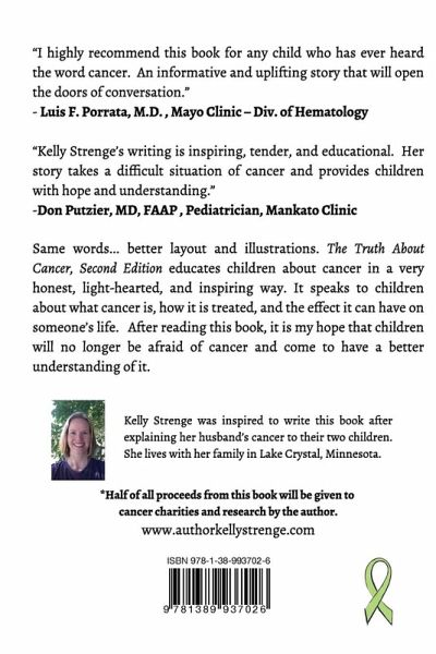 How do you explain cancer to kids? This book holds the key.... "I highly recommend this book for any child who has ever heard the word cancer. An informative and uplifting story that will open the doors of conversation." Luis F. Porrata, M.D. Mayo Clinic Kelly Strenge has been explaining cancer to children for more than a decade. The Truth About Cancer, Second Edition educates children about cancer in a very honest, light-hearted, and inspiring way. In this book kids will discover: ¿ What cancer is and how it is treated; ¿ The side effects cancer treatment can have; ¿ Who is affected by cancer; ¿ Cancer is not contagious; ¿ Ways to prevent cancer; ¿ Who they can turn to for comfort and to help them cope; ¿ Cancer doesn't define a person; ¿ There are positive aspects of the journey; and much more. The Truth About Cancer Second Edition is a wonderfully versatile nonfiction book that is beneficial to children ages 2-12. This book works perfectly whether it is a child that was diagnosed or someone they love. If you like Nowhere Hair, then you'll love Kelly Strenge's very encouraging The Truth About Cancer, Second Edition. Buy this book to provide hope and understanding for your child today! *Kelly Strenge also gives half of all proceeds from this book back to cancer charities and research.