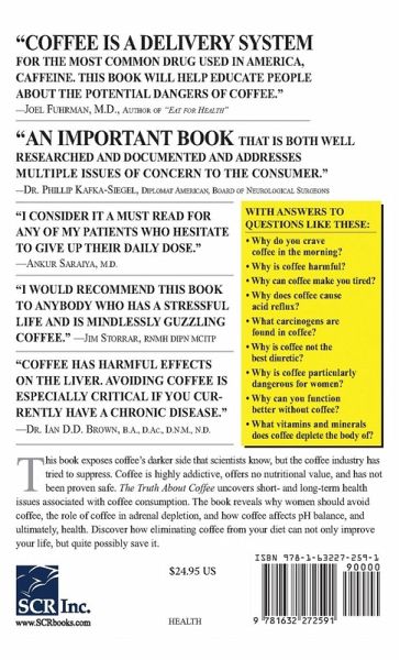 The Truth About Coffee exposes coffee's darker side that scientists know but that the beverage, confectionery and pharmaceutical industries have tried to suppress. Coffee is a highly addictive drug, does not offer any nutritional value and has not been proven safe. Epidemiological, clinical and laboratory studies link caffeine found in coffee leads to heart disease, pancreas cancer, bladder cancer, hypoglycemia and central nervous system disorders.