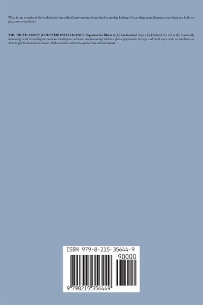 What is one to make of the world today? Are official interventions of one kind or another helping? Or are there more disasters everywhere you look, on just about every front? THE TRUTH ABOUT (COUNTER) INTELLIGENCE: Equation for Illness or Joyous Garden? takes a look behind the veil at the historically increasing trend of intelligence/counter-intelligence activities mushrooming within a global population in large and small ways, with an emphasis on what might be focused on instead. Such as nature, authentic connection and real smarts.