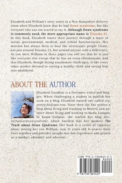 In this book, Elizabeth traces her journey beyond the maze of social, governmental, medical, and school bureaucracies that accompany people with disabilities. Her mission has always been to bust the stereotypes people create, not just around Trisomy-21 (Down syndrome) but around anyone with a difference. As you meet William in these pages, you see he is just like everyone else except that he has an extra chromosome. And Elizabeth, though facing unique challenges, is like every other mother devoted to raising a healthy child and seeing him into adulthood. Told in vignettes and bits of poetry, Elizabeth Goodhue's memoir of raising a son with Trisomy-21 is an engaging, deeply human read. Each vignette is short-so you think, "Oh, I'll read 10, then put it down." But-you read 10, then "just one more"-before you know it, you've read one-third of the book in one sitting. Though an obvious audience is parents or prospective parents of children with Trisomy-21, the audience is much broader: parents wanting to learn about advocating for their children, parents interested in a mother's parenting journey, people interested in meeting the needs and recognizing the humanity of people with disabilities, people interested in others' growth, and development in relationships. Most importantly, educators should read this book: teachers, school staff, principals, district administrators, school superintendents-all these people, especially those tasked with determining the "individual education plans" for students with disabilities - must read this book and learn how to listen, see strengths, and genuinely support students with differences. ¿¿¿¿