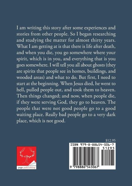 I am writing this story after some experiences and stories from other people. So I began researching and studying the matter for almost thirty years. What I am getting at is that there is life after death, and when you die, you go somewhere where your spirit, which is in you, and everything that is you goes somewhere. I will tell you all about ghosts (they are spirits that people see in homes, buildings, and wooded areas) and what to do. But first, I need to start at the beginning. When Jesus died, he went to hell, pulled people out, and took them to heaven. Then things changed; and now, when people die, if they were serving God, they go to heaven. The people that were not good people go to a good waiting place. Really bad people go to a very dark place, which is not good.
