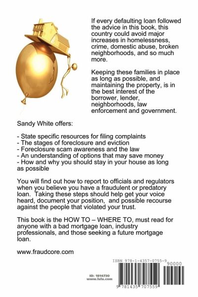 If every defaulting loan followed the advice in this book, this country could avoid increases in homelessness, crime, domestic abuse, broken neighborhoods, and so much more. Keeping these families in place as long as possible, and maintaining the property, is in the best interest of the borrower, lender, neighborhoods, law enforcement and government. Sandy White offers: * State specific resources for filing complaints; * The stages of foreclosure and eviction; * Foreclosure scam awareness and the law; * An understanding of options that may help save money; * How and why you should stay in your house as long as possible. The information in this book will help get your voice heard, document your position, and possible recourse against the people that violated your trust. This book is a must read for anyone with a bad mortgage loan, industry professionals, and those seeking a future mortgage loan.