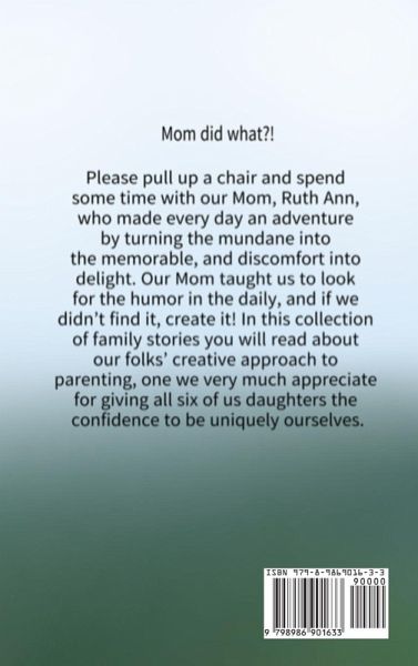 Mom did what?! Please pull up a chair and spend some time with our Mom, Ruth Ann, who made every day an adventure by turning the mundane into the memorable, and discomfort into delight. Our Mom taught us to look for the humor in the daily, and if we didn't find it, create it! In this collection of family stories you will read about our folks' creative approach to parenting, one we very much appreciate for giving all six of us daughters the confidence to be uniquely ourselves.