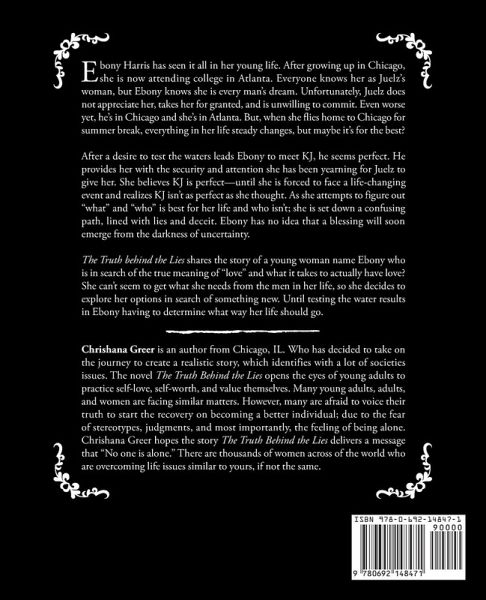 Ebony Harris has seen it all in her young life. After growing up in Chicago, she is now attending college in Atlanta. Everyone knows her as Juelz's woman, but Ebony knows she is every men's dream. Unfortunately, Juelz does not appreciate her, takes her for granted, and is unwilling to commit. Even worse yet, he's in Chicago and she's in Atlanta. But, when she flies home to Chicago for summer break, everything in her life suddenly changes, but maybe it's for the best? After a desire to test the waters leads Ebony to meet KJ, he seems perfect. He provides her with the security and attention she has been yearning for Juelz to give her. She believes KJ is perfect-until she is forced to face a life -changing event and realizes KJ isn't as perfect as she thought. As she attempts to figure out "what" and "who" is best for her life and who isn't; she is set down a confusing path, lined with lies and deceit. Ebony has no idea that a blessing will soon emerge from the darkness of uncertainty. The Truth behind the Lies shares the story of a young woman name Ebony who is in search of the true meaning of "love" and what it takes to actually have love? She can't seem to get what she needs from the men in her life, so she decides to explore her options in search of something new. Until testing the water results in Ebony having to determine what way her life should go. Chrishana Greer is an author from Chicago, IL. Who has decided to take on the journey to create a realistic story, which identifies with a lot of societies issues. The novel The Truth Behind the Lies opens the eyes of young adults to practice self-love, self-worth, and value themselves. Many young adults, adults, and women are facing similar matters. However, many are afraid to voice their truth to start the recovery on becoming a better individual; due to the fear of stereotypes, judgments, and most importantly, the feeling of being alone. Chrishana Greer hopes the story The Truth Behind the Lies delivers a message that "No one is alone." There are thousands of women across of the world who are overcoming life issues similar to yours, if not the same.
