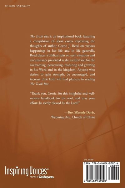 The Truth Box is an inspirational book featuring a compilation of short essays expressing the thoughts of author Corrie J. Reed on various happenings in her life and in life generally. Reed places a biblical spin on each situation and circumstance presented as she credits God for the overcoming, persevering, maturing and growing in his Word and in the kingdom. Anyone who desires to gain strength, be encouraged, and increase their faith will find pleasure in reading The Truth Box. "Thank you, Corrie, for this insightful and well-written handbook for the soul, and may your efforts be richly blessed by the Lord!" -Bro. Waverly Davis, Wyoming Ave. Church of Christ