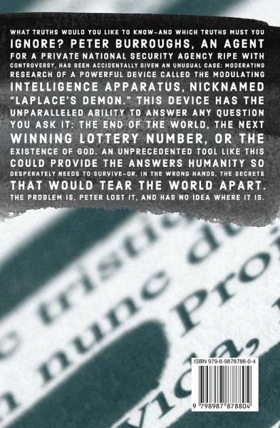 Peter Burroughs is a disgruntled agent for a private national security agency ripe with controversy. Through a bureaucratic filing error, he has been given an unusual case: moderating research of a powerful device called the modulating intelligence apparatus, nicknamed "Laplace's Demon." This device has the unparalleled ability to answer any question you ask it: the end of the world, the next winning lottery number, or even the existence of God. An unprecedented tool like this could provide the answers humanity so desperately needs to survive-or, in the wrong hands, the secrets that could tear the world apart. The problem is, Peter lost it, and has no idea where it is. The Truth Box is written from the perspective of five different narrators: William Burroughs: a war veteran struggling with reality and his past Peter Burroughs: a mediocre agent for a private security company conflicted with his unfulfilling career and personal desires Mary-Belle Lafferty: a former model and poet suffering from Huntington's Disease Jamie Lafferty: An unsuccessful artist with aspirations beyond his own abilities Arthur De La Cruz: a mild-mannered programmer plagued by a lack of purpose and obsessed with unusual conspiracies Their real selves are tested when given the chance to have any question answered truthfully-about the world, about their death, about the meaning of their lives, and the truth behind the secrets they hide from themselves and others.