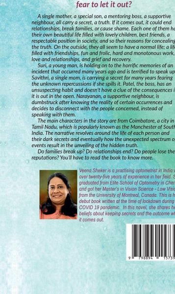 Do you carry a secret and fear to let it out? A single mother, a special son, a mentoring boss, a supportive neighbour, all carry a secret, a truth. If it comes out, it could end relationships, break families, or cause shame. Each one of them has their own beautiful life filled with lovely children, best friends, a respectable position in society, and reasons for concealing the truth. On the outside, they all seem to have a normal life - filled with friendships, fun and frolic, hard and monotonous work, love and relationships, and grief and recovery. Suri, a young man, is holding on to the horrific memories of a childhood incident and is terrified to speak up. Savithri, a single mom, is carrying a secret for many years fearing the unknown repercussions if she spills it. Patel, the boss, has an unsuspecting habit and doesn't have a clue of the consequences if it is out in the open. Narayanan, a supportive neighbour, is dumbstruck after knowing the reality of certain occurrences and decides to disconnect with the people concerned, instead of speaking with them. The main characters in the story are from Coimbatore, Tamil Nadu, popularly known as the Manchester of South India. The narrative revolves around the life of each person and their dark secrets and eventually how the unexpected spectrum of events result in the unveiling of the hidden truth. Do families break up? Do relationships end? Do people lose their reputations? You'll have to read the book to know more.