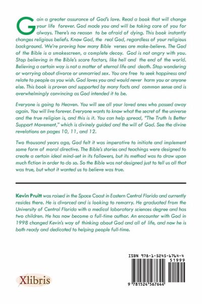 Gain a greater assurance of God's love. Read a book that will change your life forever. There's no reason to be afraid of dying. God made you and will be taking care of you for always. This book instantly changes religious beliefs. Know God, the real God, regardless of your religious background. We're proving how many Bible verses are make-believe. The God of the Bible is a smokescreen, a complete decoy. God is not angry with you. Stop believing in the Bible's scare factors, like hell and the end of the world. Believing a certain way is not a matter of eternal life and death. Stop wondering or worrying about divorce or unmarried sex. You are free to seek happiness and relate to people as you wish. God loves you and would never harm you or anyone else. You were created as God initially intended. This book is proven and supported by many facts and common sense. Everyone is going to heaven. You will see all your loved ones who passed away again. You will live forever. Everyone wants to know what the secret of the universe and the true religion is, and this is it. You can help spread, "The Truth Is Better Gospel Revision Support Movement," which is divinely guided and the will of God. See the divine revelations on pages 9, 10, and 11. Two thousand years ago, God felt it was imperative to initiate and implement some form of moral directive. The Bible's stories and teachings were designed to create a certain ideal mind-set in its followers, but its method was to draw upon much fiction in order to do so. So the Bible was not designed just to tell us all that was true, but what it wanted us to believe was true.