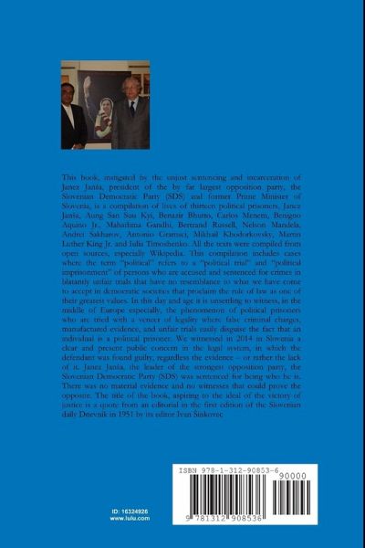 This book, instigated by the unjust sentencing and incarceration of Janez Jan¿a, president of the by far largest opposition party, the Slovenian Democratic Party (SDS) and former Prime Minister of Slovenia, is a compilation of lives of thirteen political prisoners, Janez Jan¿a, Aung San Suu Kyi, Benazir Bhutto, Carlos Menem, Benigno Aquino Jr., Mahathma Gandhi, Bertrand Russell, Nelson Mandela, Andrei Sakharov, Antonio Gramsci, Mikhail Khodorkovsky, Martin Luther King Jr. and Iulia Timoshenko. All the text were compiled from open sources, especially Wikipedia. Governments often say they have no political prisoners, only prisoners held under the normal criminal law. This compilation includes cases where the term "political" refers to a "political trial" and "political imprisonment" of persons who are accused and sentenced for crimes in blatantly unfair trials that have no resemblance to what we have come to accept in democratic societies that proclaim the rule of law as one of their greatest values.