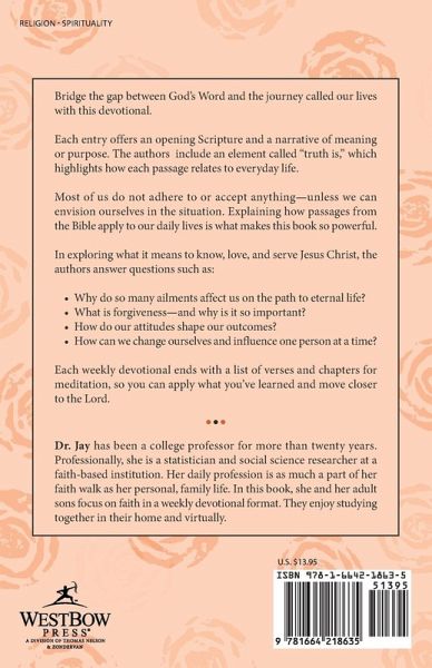 Bridge the gap between God's Word and the journey called our lives with this devotional. Each entry offers an opening Scripture and a narrative of meaning or purpose. The authors include an element called "truth is," which highlights how each passage relates to everyday life. Most of us do not adhere to or accept anything-unless we can envision ourselves in the situation. Explaining how passages from the Bible apply to our daily lives is what makes this book so powerful. In exploring what it means to know, love, and serve Jesus Christ, the authors answer questions such as: Why do so many ailments affect us on the path to eternal life? What is forgiveness-and why is it so important? How do our attitudes shape our outcomes? How can we change ourselves and influence one person at a time? Each weekly devotional ends with a list of verses and chapters for meditation, so you can apply what you've learned and move closer to the Lord.