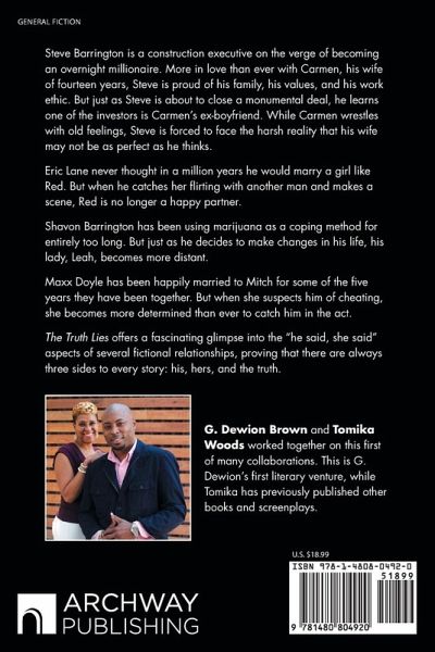 Steve Barrington is a construction executive on the verge of becoming an overnight millionaire. More in love than ever with Carmen, his wife of fourteen years, Steve is proud of his family, his values, and his work ethic. But just as Steve is about to close a monumental deal, he learns one of the investors is Carmen's ex-boyfriend. While Carmen wrestles with old feelings, Steve is forced to face the harsh reality that his wife may not be as perfect as he thinks. Eric Lane never thought in a million years he would marry a girl like Red. But when he catches her flirting with another man and makes a scene, Red is no longer a happy partner. Shavon Barrington has been using marijuana as a coping method for entirely too long. But just as he decides to make changes in his life, his lady, Leah, becomes more distant. Maxx Doyle has been happily married to Mitch for some of the five years they have been together. But when she suspects him of cheating, she becomes more determined than ever to catch him in the act. The Truth Lies offers a fascinating glimpse into the "he said, she said" aspects of several fictional relationships, proving that there are always three sides to every story: his, hers, and the truth.
