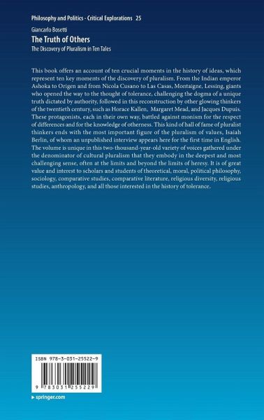 This book offers an account of ten crucial moments in the history of ideas, which represent ten key moments of the discovery of pluralism. From the Indian emperor Ashoka to Origen and from Nicola Cusano to Las Casas, Montaigne, Lessing, giants who opened the way to the thought of tolerance, challenging the dogma of a unique truth dictated by authority, followed in this reconstruction by other glowing thinkers of the twentieth century, such as Horace Kallen, Margaret Mead, and Jacques Dupuis. These protagonists, each in their own way, battled against monism for the respect of differences and for the knowledge of otherness. This kind of hall of fame of pluralist thinkers ends with the most important figure of the pluralism of values, Isaiah Berlin, of whom an unpublished interview appears here for the first time in English. The volume is unique in this two-thousand-year-old variety of voices gathered under the denominator of cultural pluralism that they embody in the deepest andmost challenging sense, often at the limits and beyond the limits of heresy. It is of great value and interest to scholars and students of theoretical, moral, political philosophy, sociology, comparative studies, comparative literature, religious diversity, religious studies, anthropology, and all those interested in the history of tolerance.