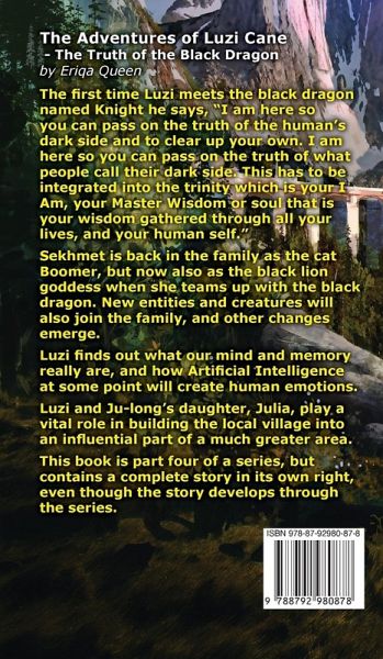 This is not a story based on drama and conflict, but loaded with a deep understanding of the human and beyond and hints at transformative choices in life. The first time Luzi meets the black dragon named Knight he says, "I am here so you can pass on the truth of the human's dark side and to clear up your own. I am here so you can pass on the truth of what people call their dark side. This has to be integrated into the trinity which is your I Am, your Master Wisdom or soul that is your wisdom gathered through all your lives, and your human self." Sekhmet is back in the family as the cat Boomer, but now also as the black lion goddess when she teams up with the black dragon. New entities and creatures will also join the family, and other changes emerge. Luzi finds out what our mind and memory really are, and how Artificial Intelligence at some point will create human emotions. Luzi and Ju-long's daughter, Julia, play a vital role in building the local village into an influential part of a much greater area. This book is part four of a series, but contains a complete story in its own right, even though the story develops through the series.